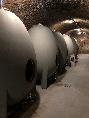 El ambiente natural, protegido del ruido y de agresiones externas, contribuye al proceso lento y equilibrado de maduración y crianza de los vinos. Barricas, foudres y hasta unos cuantos depósitos ovoides de hormigón están situados en esta hermosa bodega subterránea. Da gusto recorrer estas galerías escavadas en la tierra por los antepasados y disfrutar de la mezcla de aromas que desprenden los mostos y el vino que madura y se forma en los diferentes recipientes. Todo un privilegio poder disfrutar de una experiencia como esta.