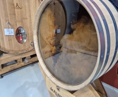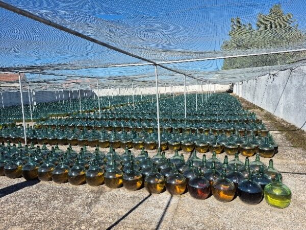 Como muy bien hemos podido comprobar de la mano de Ángeles Jiménez durante todo el recorrido, en la bodega cuidan con paciencia y esmero todas sus elaboraciones, pero se nota, (lo notamos en el brillo de los ojos del personal de la bodega cuando hablan de ellos), que los más “Mimados” de todos son los vinos generosos, quizá los más premiados de la bodega, como su De Alberto DORADO. Un vino encabezado, con base de Verdejo y crianza oxidativa, que envejece en botas jerezanas (500-600 litros) por el sistema de solera. El proceso es menos complejo que en Jerez o Montilla-Moriles, ya que se limitan a rellenar las sacas que destinan al embotellado (en torno a un 10% del contenido de la bota) con vinos que han permanecido a la intemperie en las cerca de 10.000 damajuanas de cristal o Cántaras, (llegó a haber más de 50.000), que conforman una hermosa explanada en la bodega conocida como “Playa de damajuanas” .