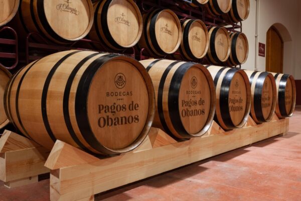 La bodega también dispone de unas modernas instalaciones, perfectamente equipadas y tecnificadas con una alta capacidad productiva. Aquí elaboran muy buenos vinos tintos, rosados y también blancos. Está equipada con 36 depósitos autovaciantes de 50.000 litros, todos ellos con camisas refrigerantes y controlados de forma automática, que permiten la elaboración de muy buenos vinos a partir de las uvas propias de la Bodega y también de algunos viticultores locales con los que llevan años colaborando y controlando sus producciones. De esta forma, Pagos de Obanos es capaz de elaborar más de 3 millones de litros de vino y superar los 4 millones de litros en capacidad total de almacenamiento. Así mismo, cuenta con una hermosa Sala de Barricas que, según nos dicen, puede albergar más de 2.000 barricas y una moderna línea de embotellado con capacidad para embotellar hasta 7.000 botellas/hora.