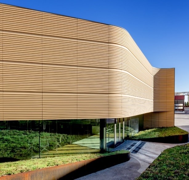 Rodeada de viñedos y olivares, parece como si aquí todo estuviera conectado con la tierra. De este modo, también para la fachada del nuevo edificio porque tuvieron la buena idea de elegir un material natural. En el material y la forma, las placas de cerámica recuerdan a las tradicionales vasijas de arcilla con pequeñas acanaladuras en las que maduraba el vino. Esto intentaron trasladar a esta bonita fachada con placas en color amarillo terracota que envuelven el edificio de una forma completamente natural y generan a su vez un dinamismo especial gracias a la estructura acanalada de estas placas que embellece el conjunto.